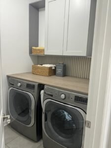 In this modern laundry room, the subtle use of...