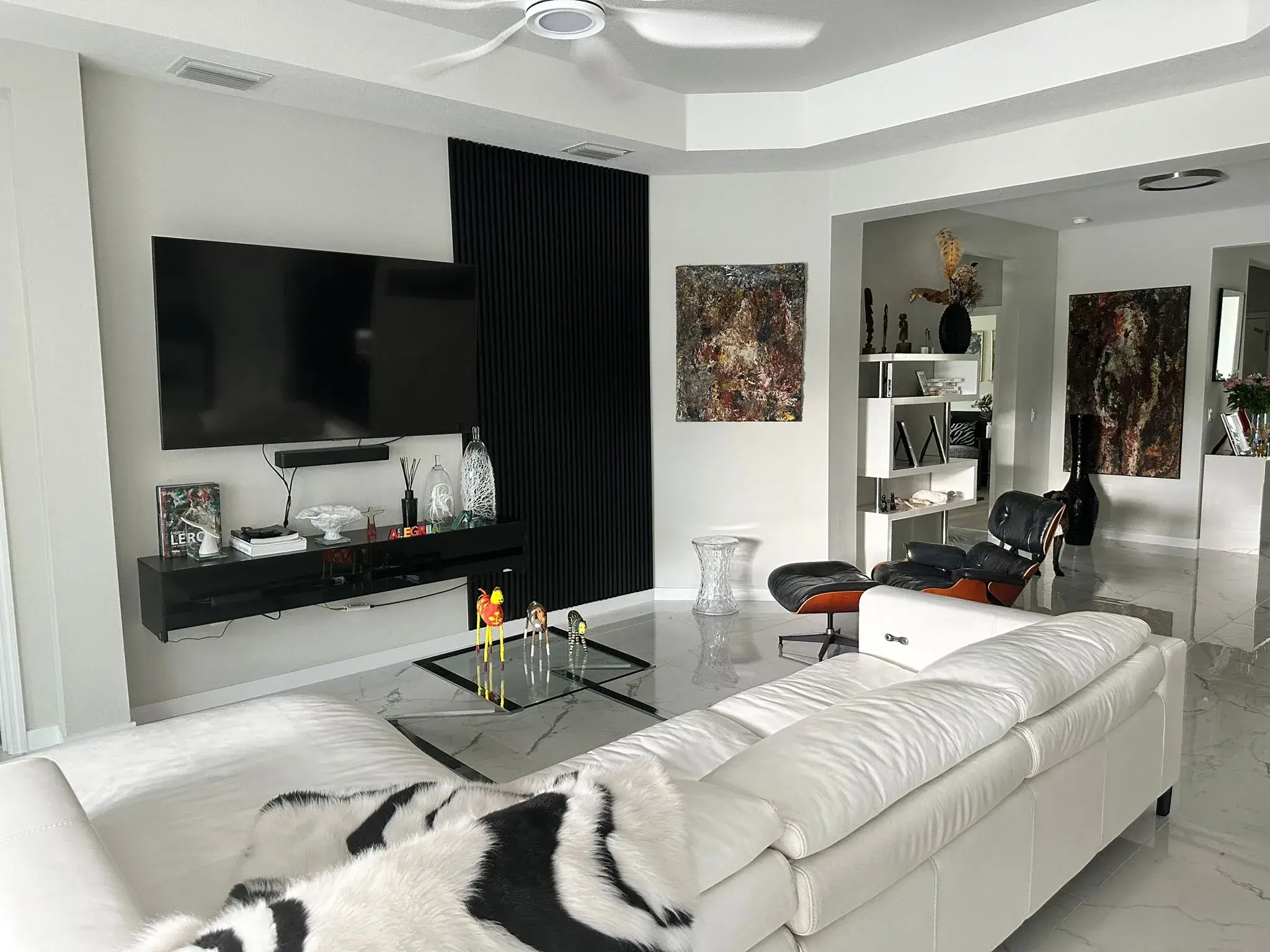 Rather than cluttering the wall with shelves or decoration, the slatted surface itself becomes the visual statement. It frames the mounted TV and floating console elegantly, providing a clean and cohesive backdrop that complements the surrounding art, furnishings, and lighting.